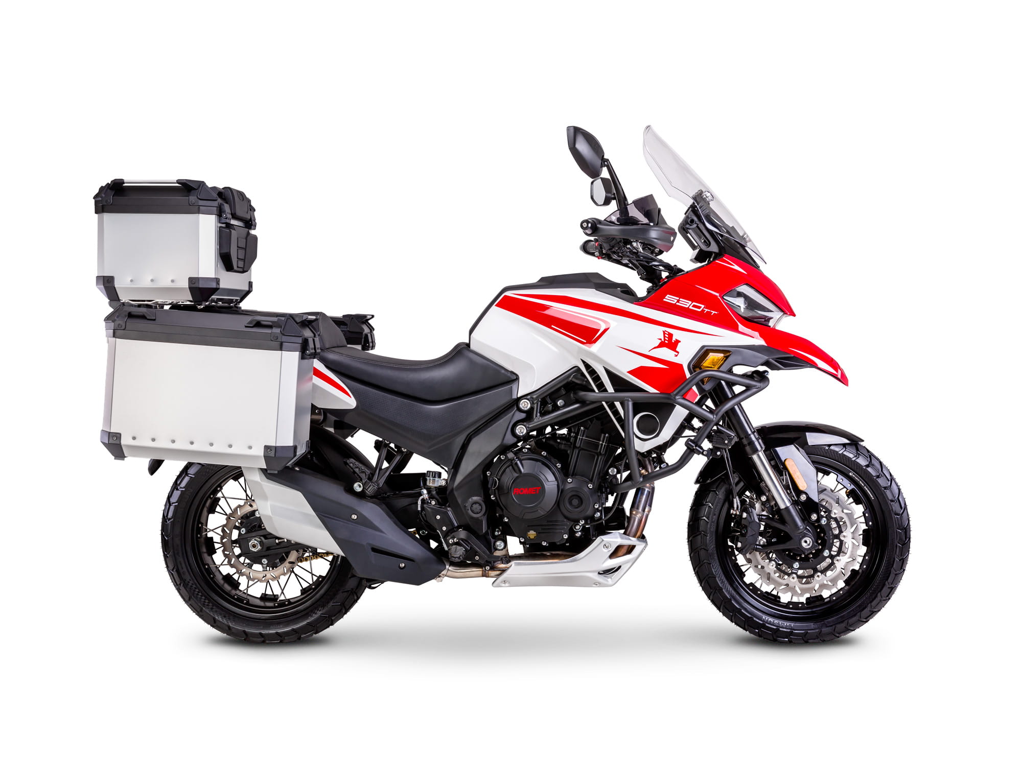 Romet ADV 530 nap?dzany jest dwucylindrowym, czterosuwowym silnikiem o pojemno?ci 500 cm3, które generuje a? 42,8 KM mocy maksymalnej. Dzi?ki temu ten terenowy turystyk mo?e rozp?dzi? si? do 170 km/h, a w trasie bez problemu utrzymasz 130 km/h. Jednostka nap?dowa spe?nia oczywi?cie normy emisji spalin Euro 5.