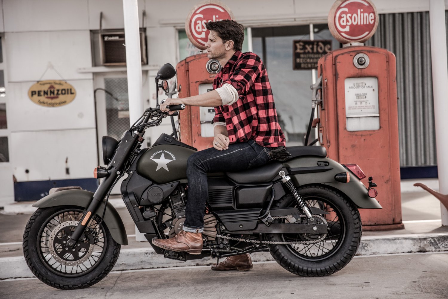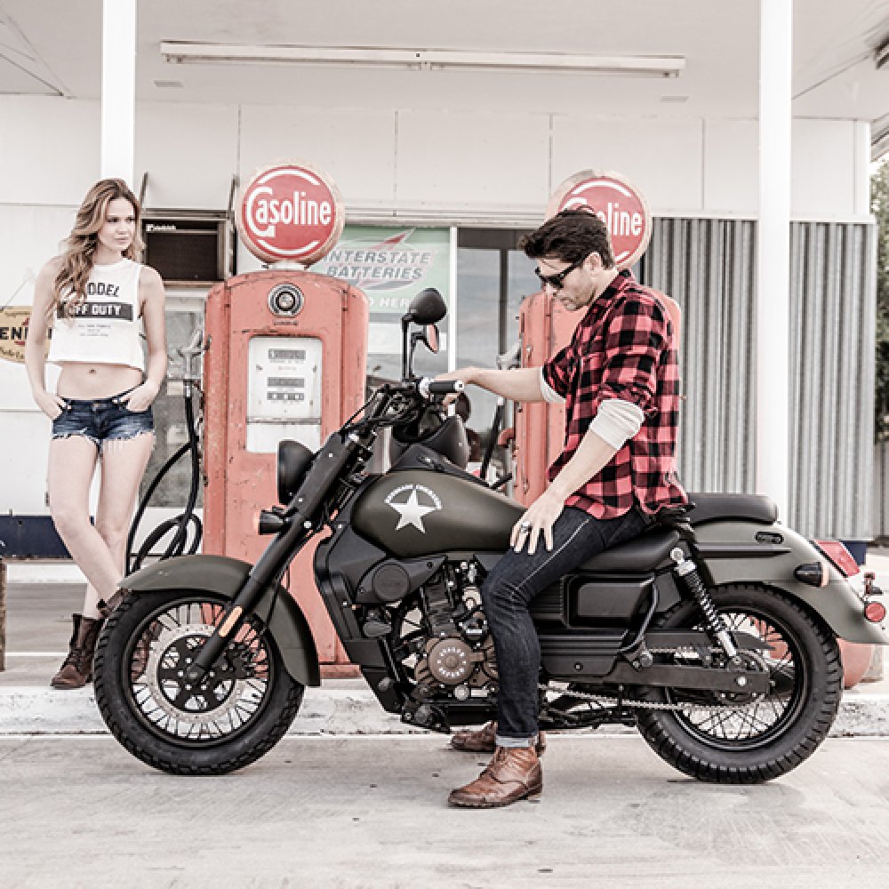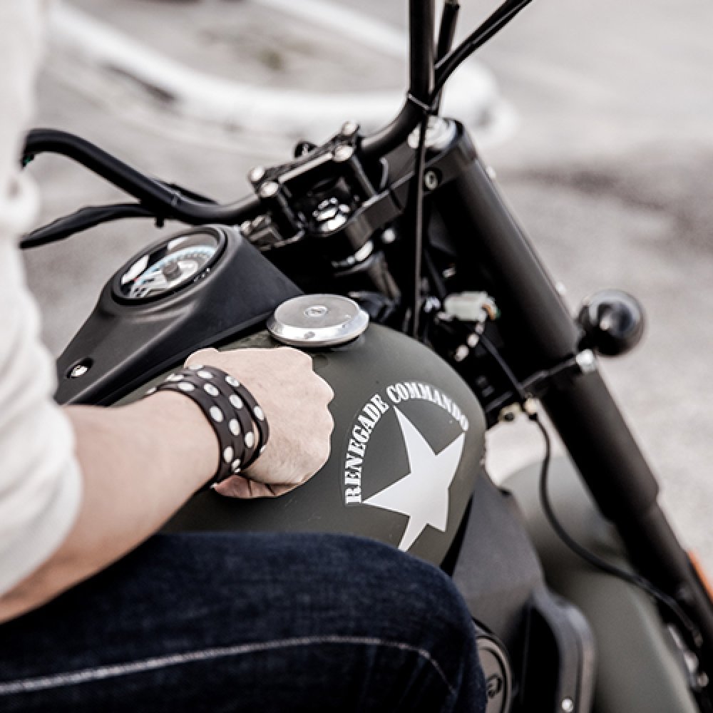 W UM Renegade Commando 125 liczy się styl, który nawiązuje do amerykańskich motocykli wojskowych. Na pomalowanym matowym lakierem zbiorniku paliwa dumnie prężą się gwiazdy w militarnym stylu. Reflektor zamontowany na płycie z przetłoczeniami stylizowanymi na oznaczenia oficerskie z pagonów. Całości dopełniają prosty, ciemny wydech i zjawiskowe szprychowe felgi. Wnikliwi obserwatorzy dostrzegą takie akcenty jak gripy w kontrastowym kolorze oraz dyskretne gmole, które ochronią motocykl. Obszerna kanapa oraz przesunięta w stronę motocyklisty kierownica i duże podnóżki zapewniają komfort w długiej podróży. Z UM Renegade Commando 125 będziesz gotowy na każdą przygodę.