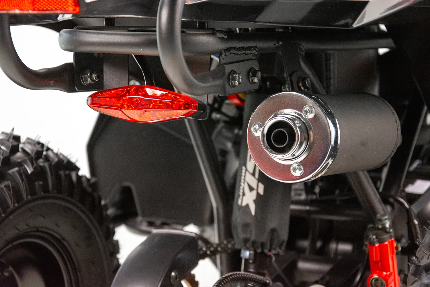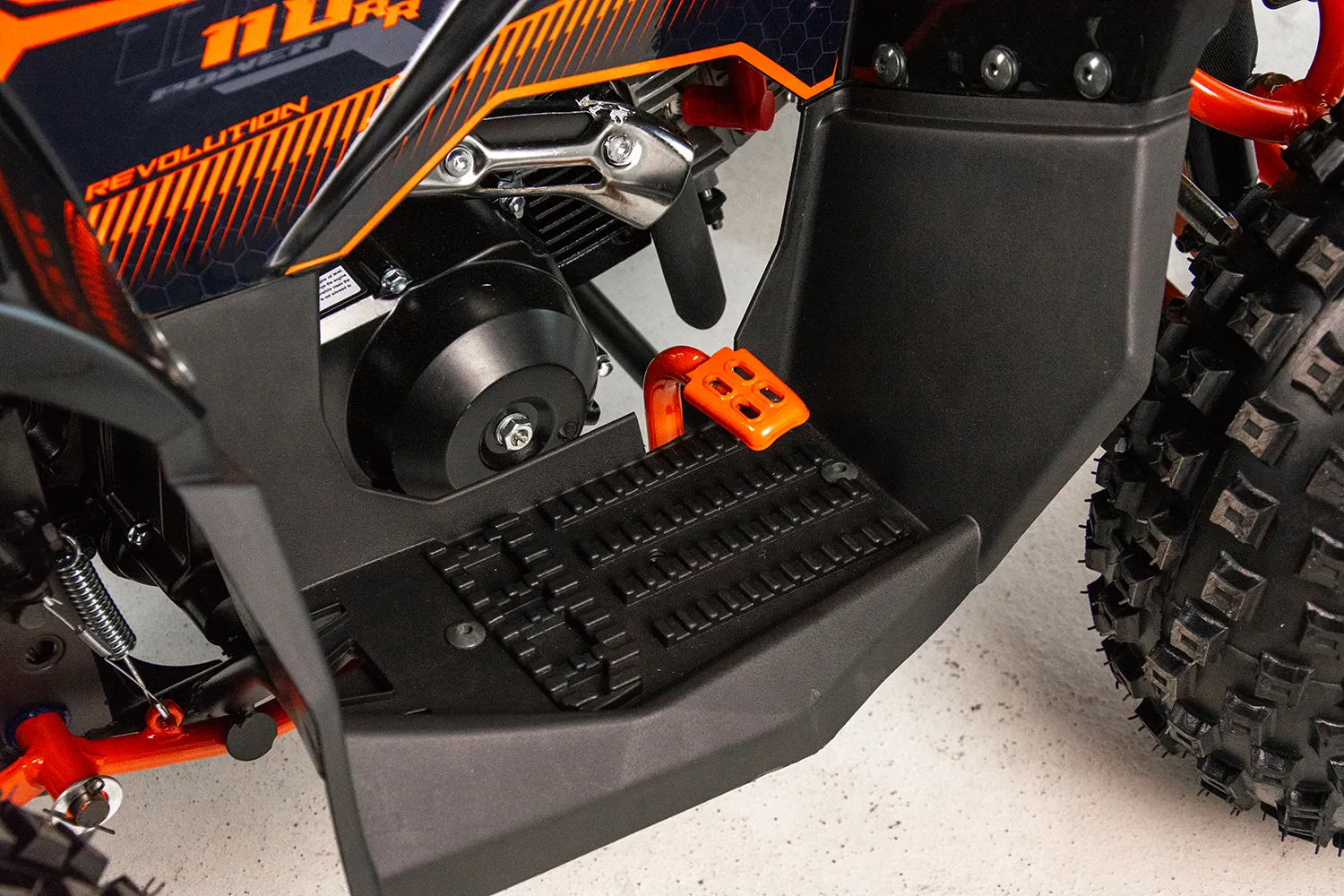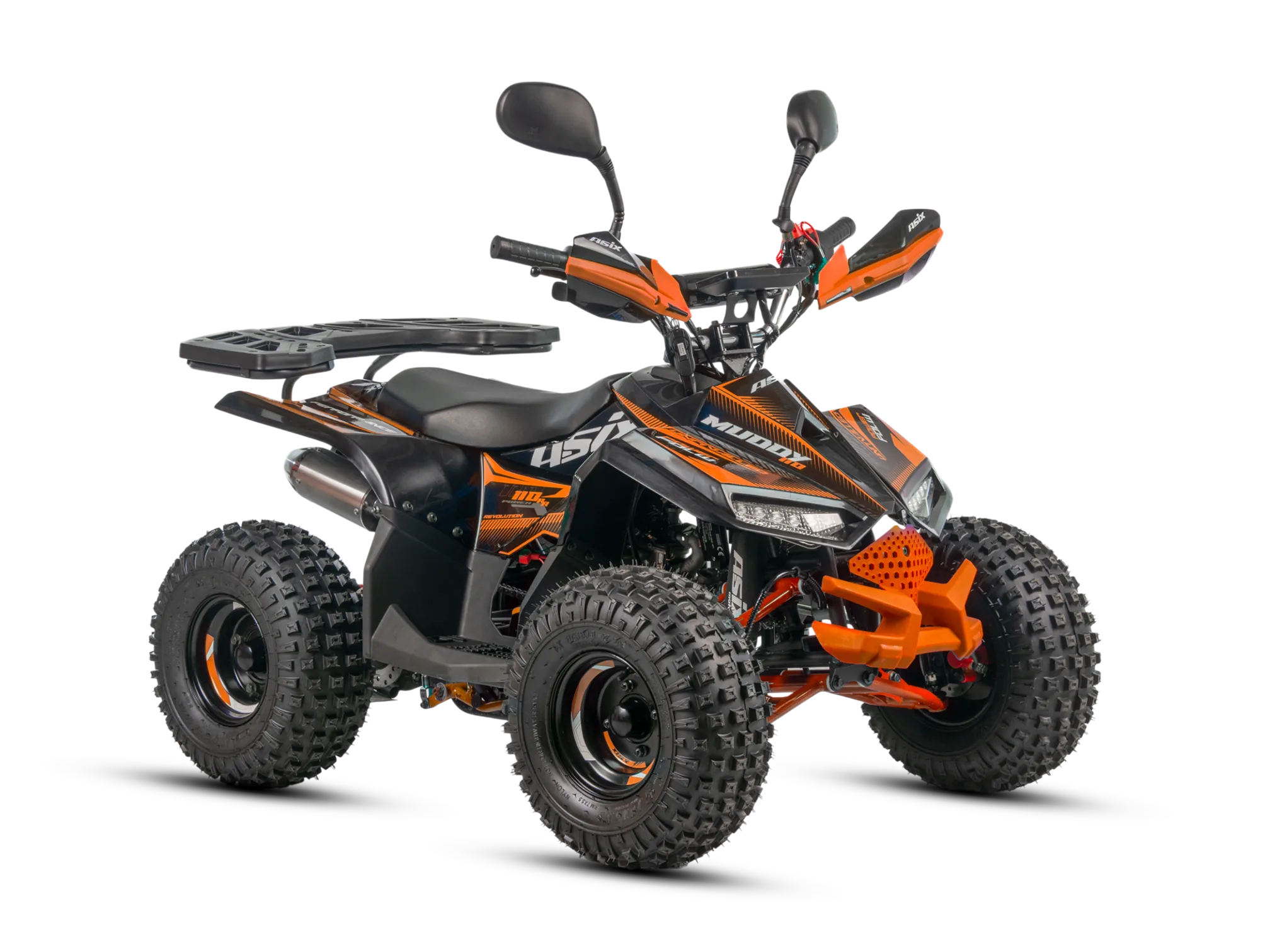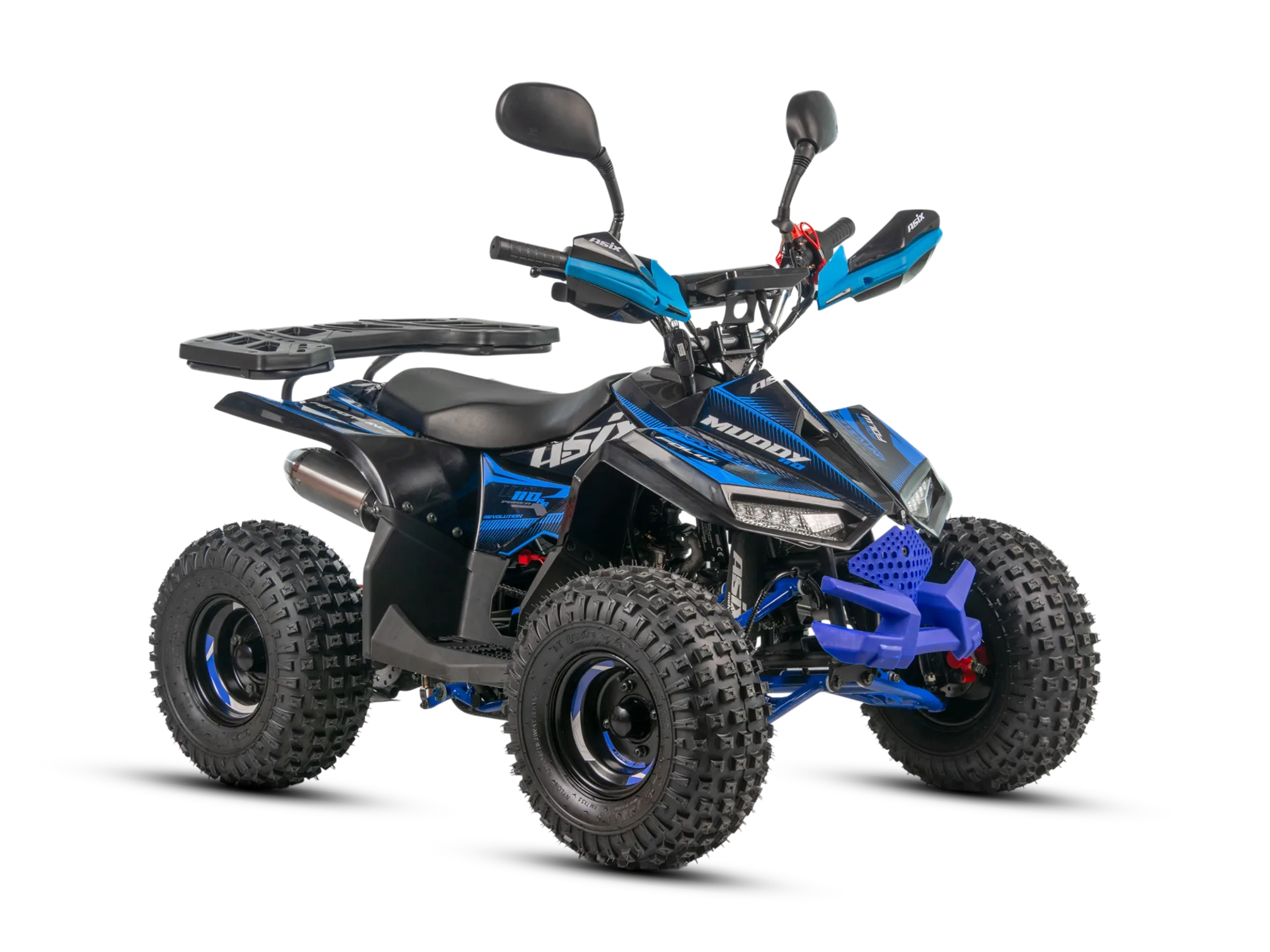 Quad MUDDY to pojazd odpalany na rozrusznik elektryczny. Napędzany jest silnikiem czterosuwowym o pojemności 110cm3 ze skrzynią automatyczną +wsteczny. Pojazd przeznaczony dla dzieci od 6 lat. Sportowy quad z oświetleniem przód-tył, zrywką bezpieczeństwa oraz regulacją prędkości na kołach 7″