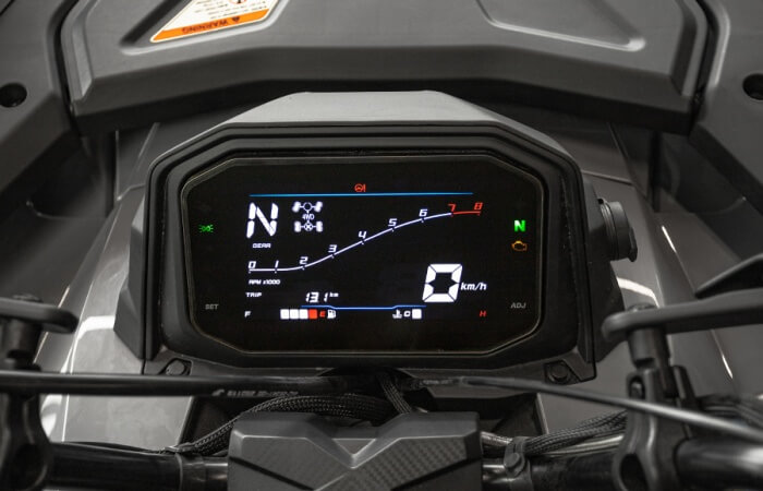 Nowoczesny 7-calowy wyświetlacz TFT automatycznie przełącza tryb dzienny i nocny w zależności od warunków oświetleniowych. Czytelnie prezentuje wszystkie ważne informacje o prędkości, obrotach, temperaturze silnika czy poziomie paliwa. Nie brakuje wskaźnika aktualnie włączonego przełożenia, wybranego napędu ani trybu jazdy.
